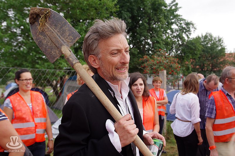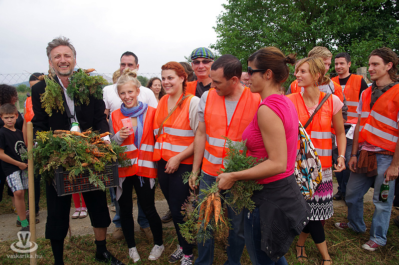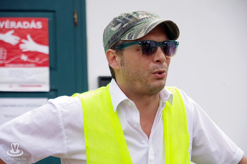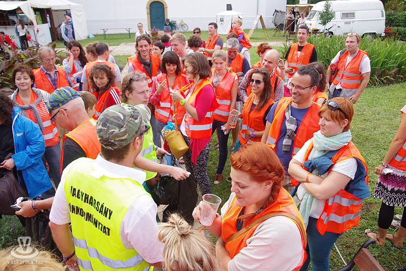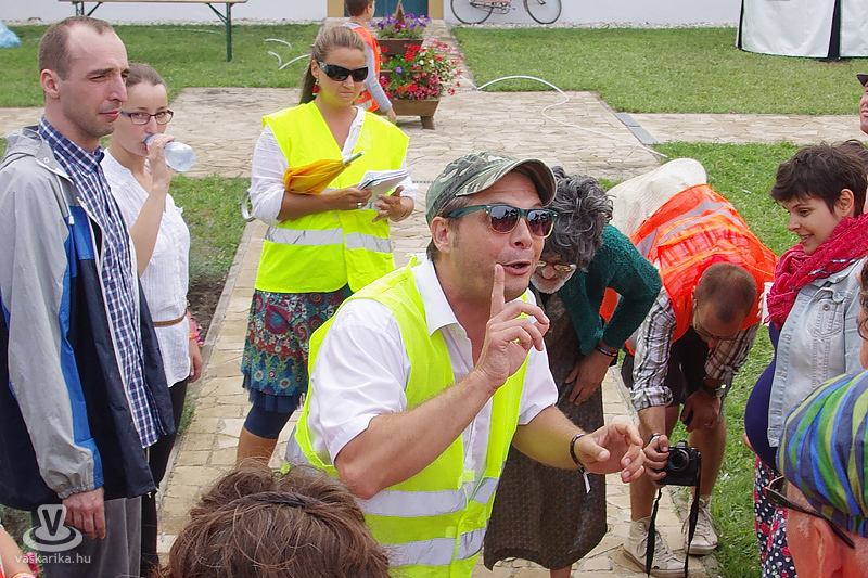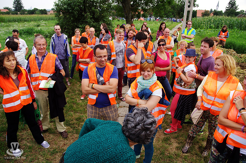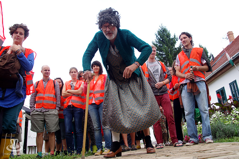Köles Feri a templomkertben maga köré gyűjtött minket és beavatott a tutiba: az NKA 403 programra adott engedélyt a Katlanban, ez a 404., így ez már nem a fesztivál része. Plusz a létszámunknál fogva is kimerítjük a mozgalom fogalmát... Emiatt mindegyikünk kap egy-egy narancssárga láthatósági mellényt, mert ekkora létszámban csak közhasznú munkásként alkothatunk csoportot. Faluturisták leszünk- közhasznú munkásoknak álcázva.
