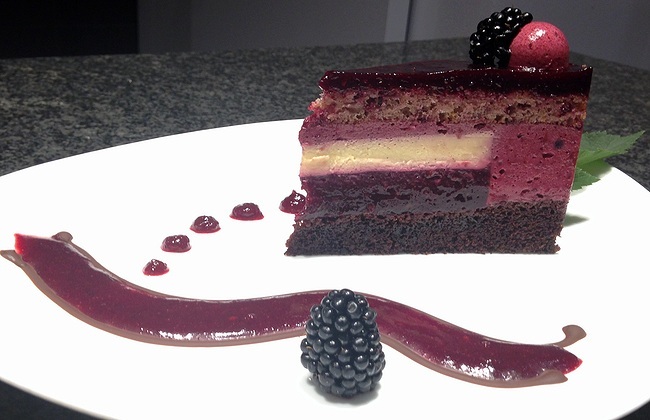 Szeletenként szedermousse félgömbökkel, szederszemekkel díszítjük.