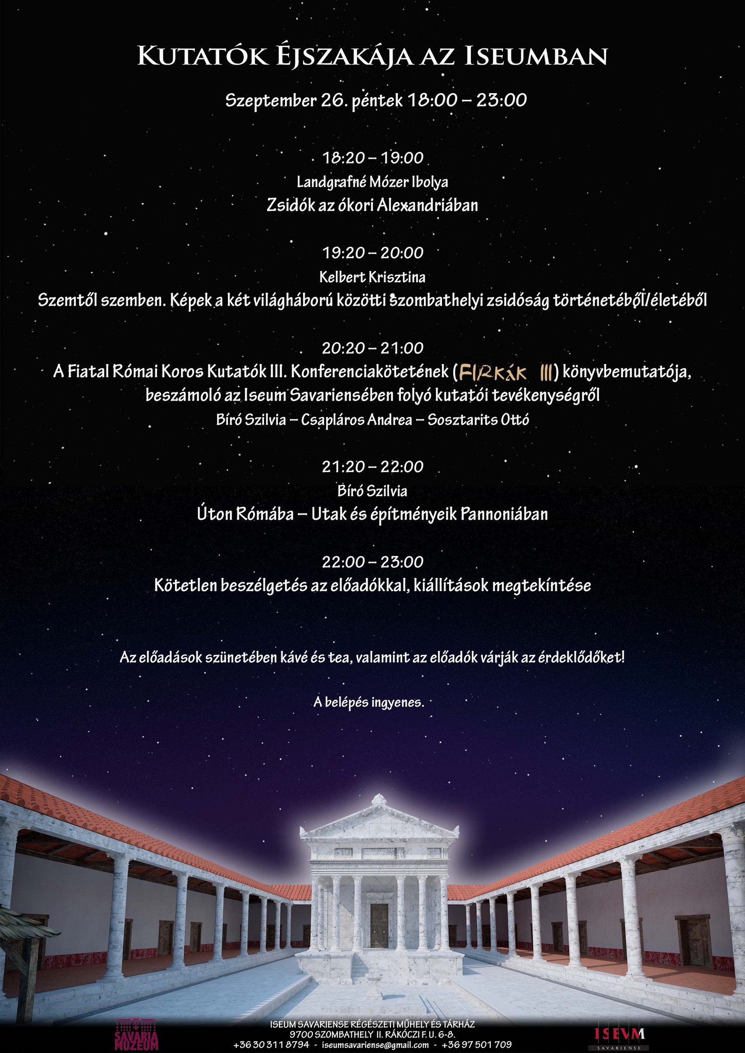 - 20:20-21:00 A Fiatal Római Koros Kutatók III. Konferenciakötetének (FIRKÁK III.) könyvbemutatója, beszámoló az Iseum Savariensében folyó kutatói tevékenységről (Bíró Szilvia - Csapláros Andrea - Sosztarits Ottó )