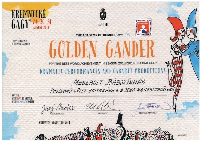 A Mesebolt Bábszínház kapta a körmöcbányai fesztivál legjobb drámai előadásnak járó Arany gúnár-díjat. A társulat az átadáson nem lehetett már ott, mert tovább kellett utazniunk a nyíregyházi Vidor Fesztiválra, viszont a minap végre megérkezett az Arany Gúnár díj!