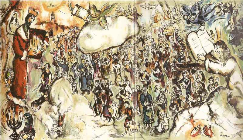 Amikor a Kneszetet építették, híres művészeket kértek fel a belső termek díszítésére, így esett Marc Chagall-ra a választás, aki az aulában készítette el művét. A triptichon egyik oldalán a megváltás misztériumát láthatjuk: Dávid bevonulását Jeruzsálembe, a másik oldalán Ézsaiás próféta álmát ábrázolja a művész, a béke gondolatát, amikor együtt fog legelészni a bárány és a farkas, és nem lesz többé háború. A kompozíció középső eleme az Exodus. Fő gondolata a szabadság, a kijövetel a rabszolgaságból. A Tóra második könyve az Exodus, mely az Egyiptomból való kivonulás történetét dolgozza fel. Az egész művet áthatja a kijövetel gondolata. Chagall egymás fölé helyezi az idősíkokat, múlt és jelen összefonódik. Ahogy a tabló címe is jelzi, megtalálhatjuk rajta a kivonulást Mózessel, akit a hagyomány szerint szarvval ábrázol. A nép kijön Egyiptomból, és kezdettét veszi a 40 éves vándorlás a rabszolgaságból a szabadságba. Az emberek azonban gyakran visszavágytak Egyiptomba a nélkülözések idején, ez az ellentmondás is megfigyelhető Chagall alkotásán.
