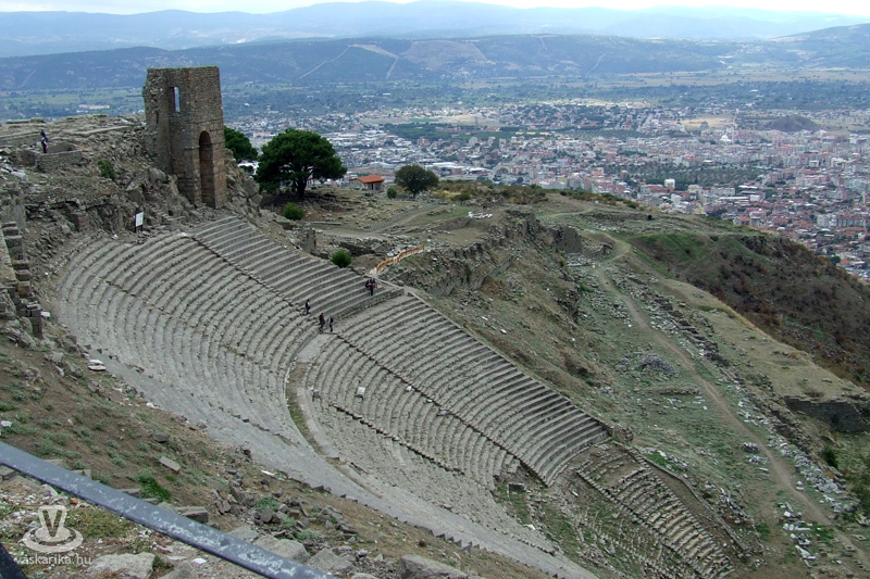 Kimondhatatlan nevű török városokon, - Salihli, Turgutlu, Manisa és Menemen - mentünk át, mire újra az Égei-tenger partjára kerültünk. Északra vettük az irányt Bergama (Pergamon) felé a rendkívül forgalmas úton. Szombat lévén nagy volt a jövés-menés, ilyenkor török családok ezrei indulnak útra rokonlátogatásra. Az ókori görög település, Pergamon, a mai Bergama város körül fekszik. Eddig még nem tévedtünk el egy török városban sem, de itt olyan nagy volt a káosz az útfelújításoknak és úteltereléseknek köszönhetően, hogy a végén már azt sem tudtuk, hol vagyunk. Még arra sem volt lehetőségünk, hogy egy pillanatra megálljunk és érdeklődjünk, nem volt szabad parkolóhely sehol. Végül egy információs táblát követve megtaláltuk a fellegvárra vezető utat, de arról később kiderült, hogy az egy libegőhöz vezet, amivel szintén fel lehetett jutni a hegyre. Pár perces libegéssel ég és föld között, a domboldalon legelő birkák felett átsuhanva a felvonó meg is érkezett az 1063 m magasan fekvő Akropoliszra. A hegyről lenyűgöző kilátás nyílik a környező hegyekre, a mélyben fekvő városra és az északi oldalon látható mélyzöld színű mesterséges tóra, amely egy völgyben bújik meg.