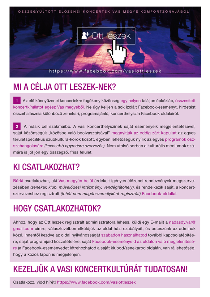 Ma, az élőzene népszerűségének "szűk esztendeiben" különösen fontos, hogy sokan tudjanak egy-egy vonzáskörzeten belüli koncertről. Mint ahogy az is, hogy egy bizonyos komfortzónán belül lehetőleg ne legyenek az - amúgy sem túl népes - közönséget tovább daraboló egymásra szervezések... Szintén jó, ha az élőzenei eseményeket segítő médiapartnerek is a lehető leghamarabb juthatnak információhoz. Hát lehet mindezeknek a prioritásoknak egyszerűbb asszisztenciája, mint egy facebook-közösség? Fókuszálódjunk, vasiak! Legyünk "sokan kevesen!