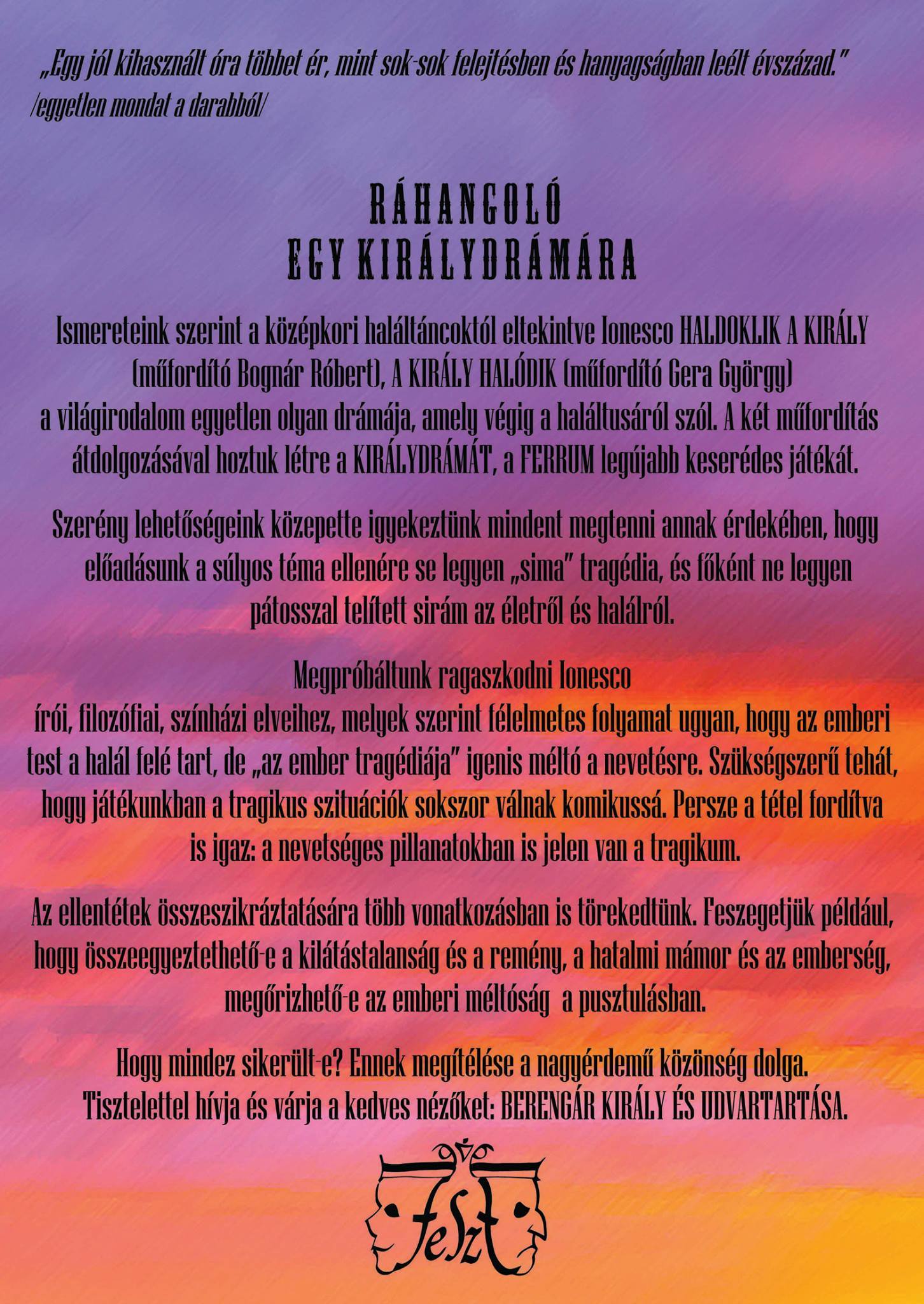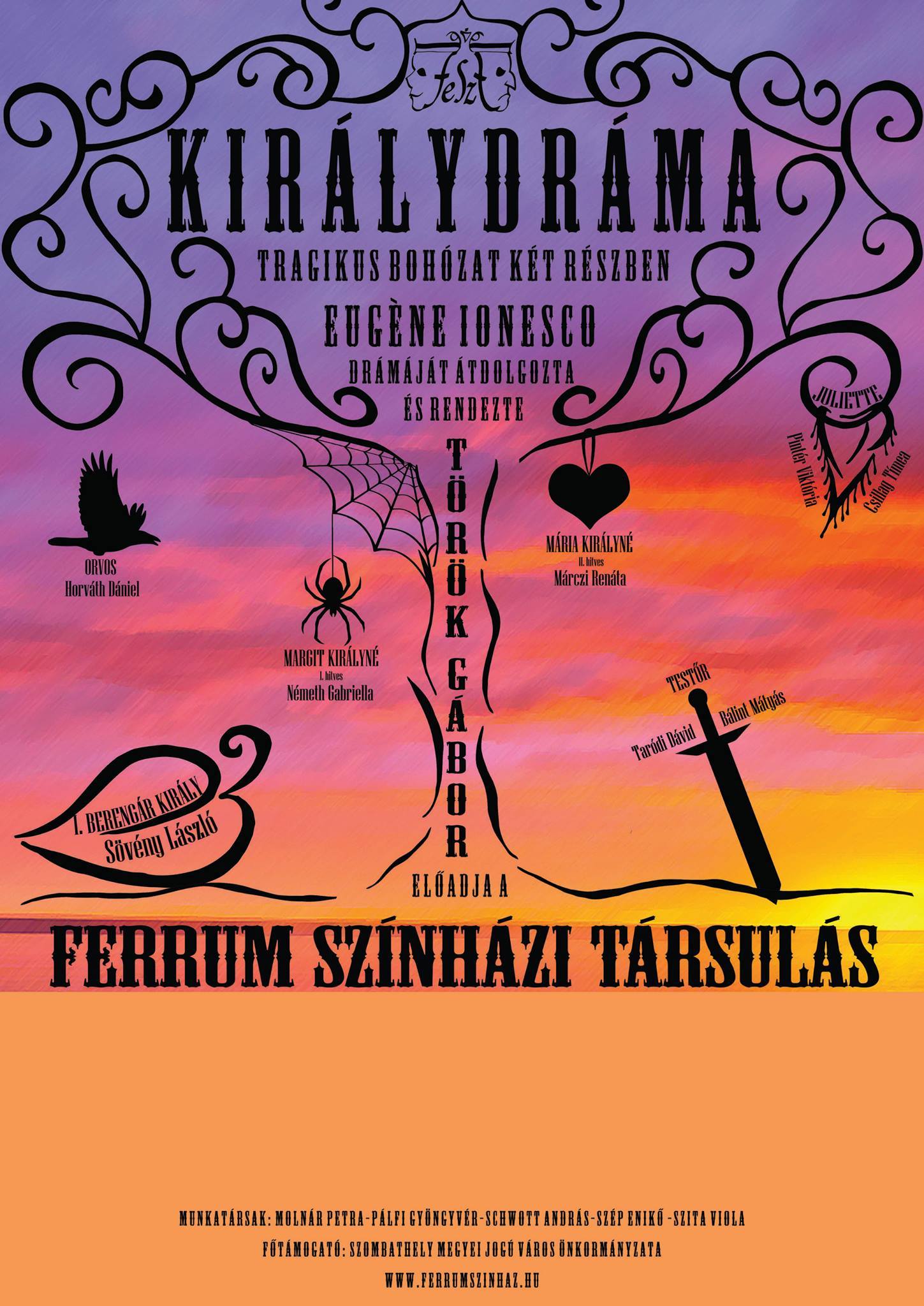 Egy tragikus bohózattal, Eugène Ionesco: Királydráma című művével áll legközelebb közönség elé a Ferrum Színházi Társulás. A premier előadás időpontja március 7. 19 óra, a második előadásé 2015. március 10. 19 óra. Az előadások helyszíne: Don Bosco Művelődési Ház.