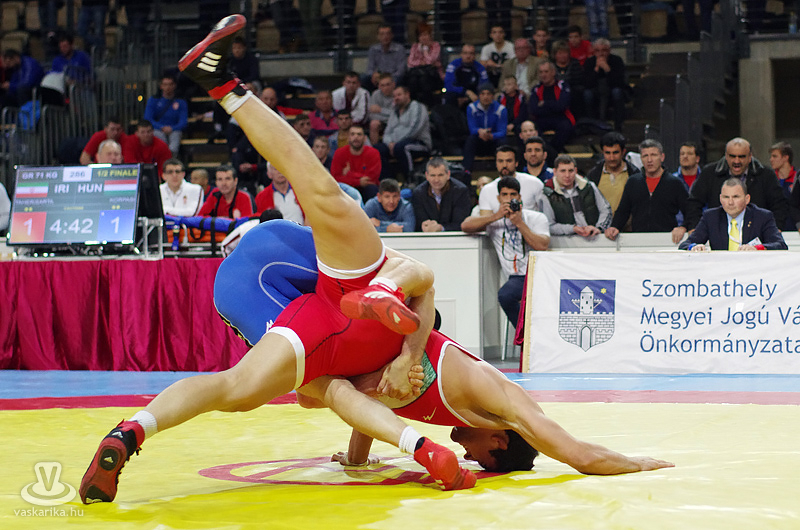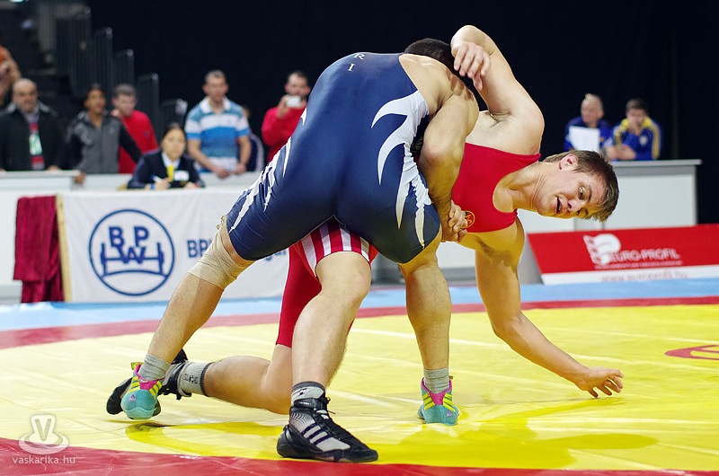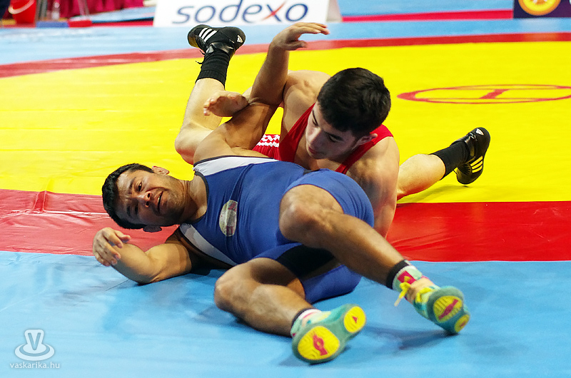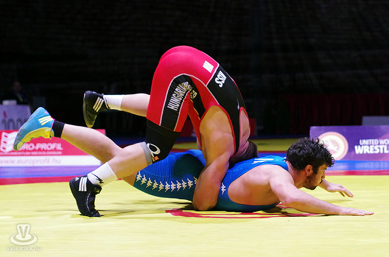 Korpási Bálint (kékben) és Ilie Cojocari "akrobatikája" a 71 kg-osok döntőjében