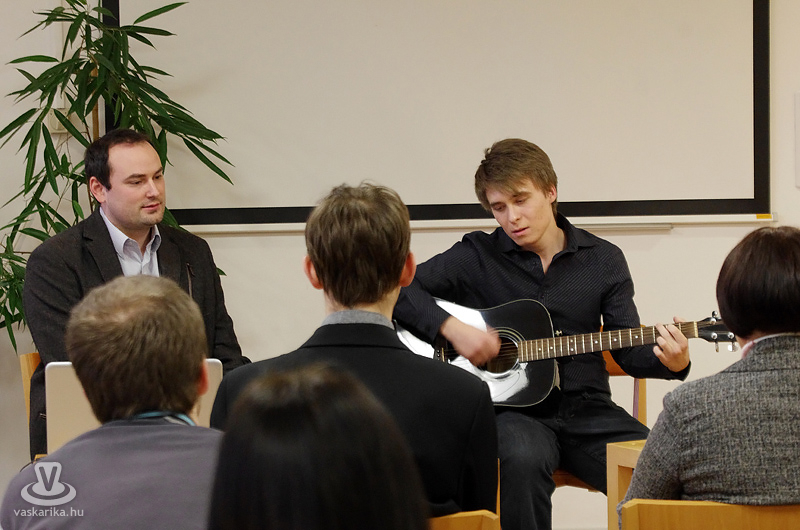 A Bájoló második évadának utolsó, negyedik előadása várta március 11-én a könyvtárba érkezőket. A főszerep egy premontreis diáké, Vesztergom Péteré volt. Ő állt szerdán mindenki számára kedvelt dalokkal a Berzsenyi Dániel Könyvtár képzeletbeli színpadán. Líraiság, kedvesen áradó romantika, fiatalos báj - mindenből kaptunk egy "gombnyit", mi jellemezhet egy végzős gimnazistát, azaz magát a "kabátot".