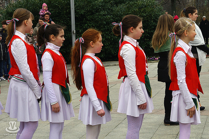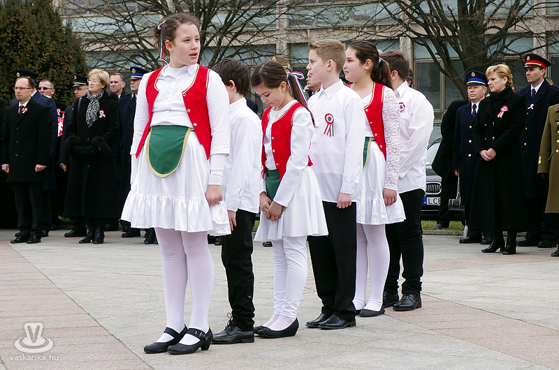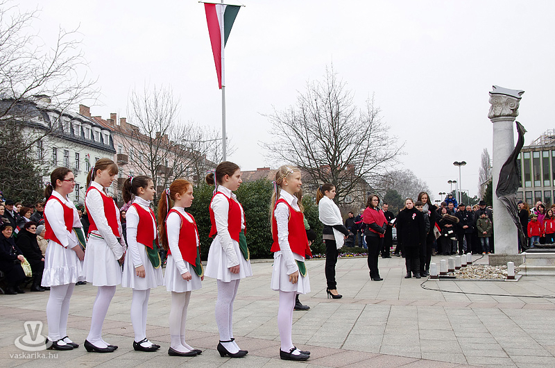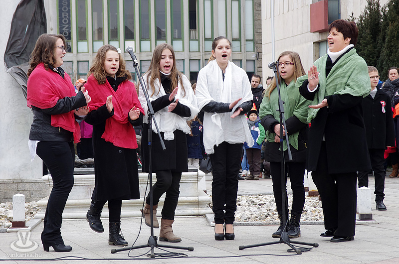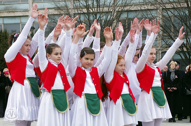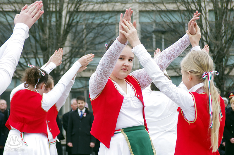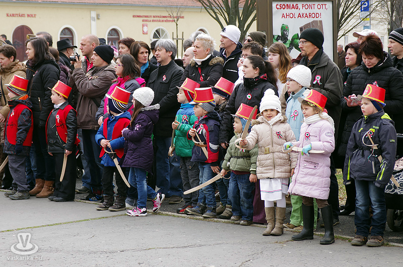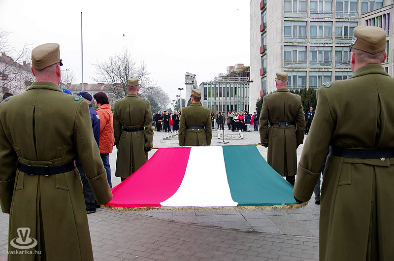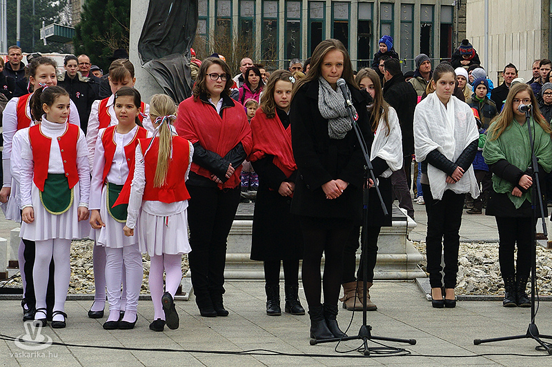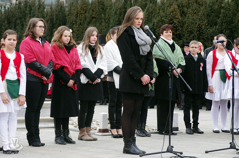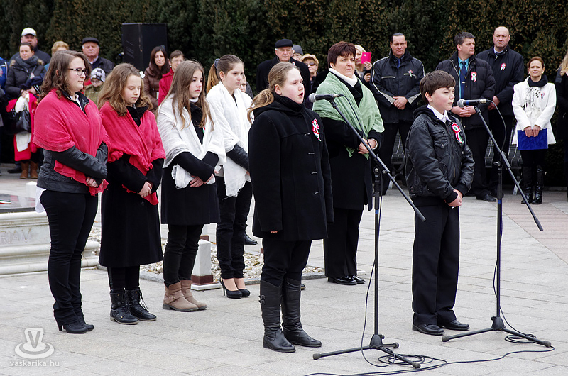 Ezt követően az ünneplő menet a Március 15-e térre vonult, ahol katonai tiszteletadás mellett először az országzászló ünnepélyes felvonására került sor, majd a Neumann János Általános Iskola diákjai adták elő ünnepi műsorukat, s nemcsak a 6-tagú énekkar, de általuk mi is kívül-belül piros, fehér, zöldbe burkolóztunk. A szürke időnek megadta az éles kontrasztot a zászlórúdra simuló lobogó és a megemlékezők kokárdáinak trikolorja.