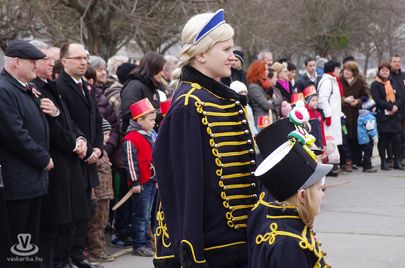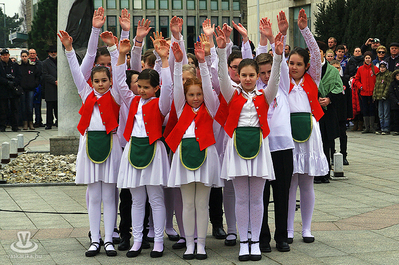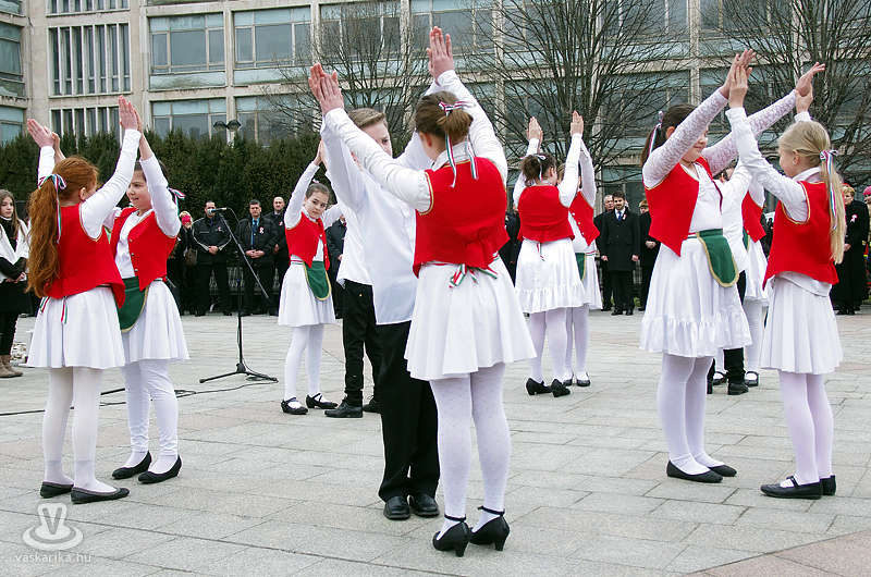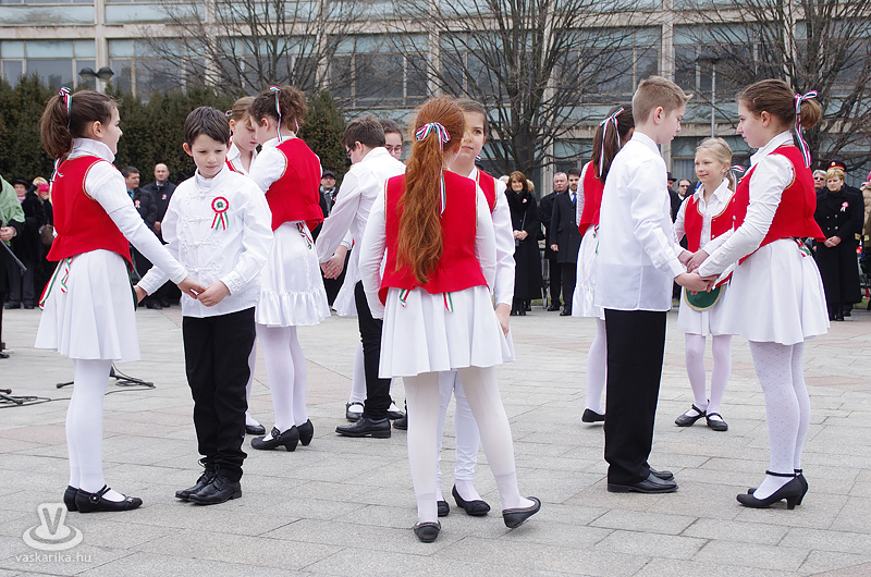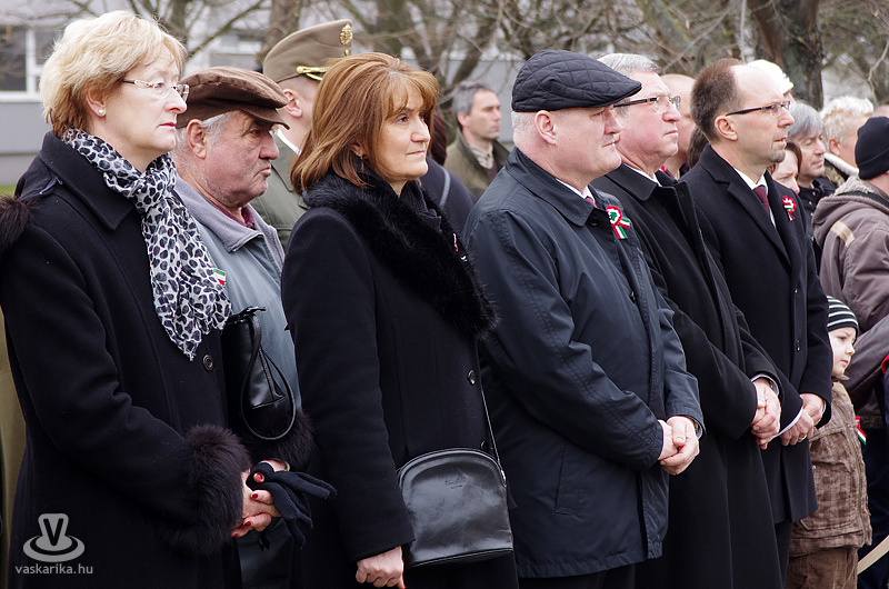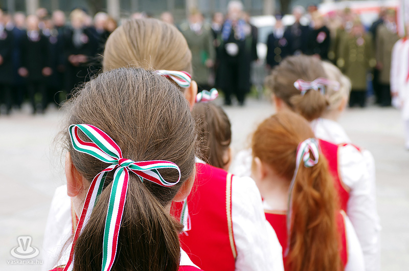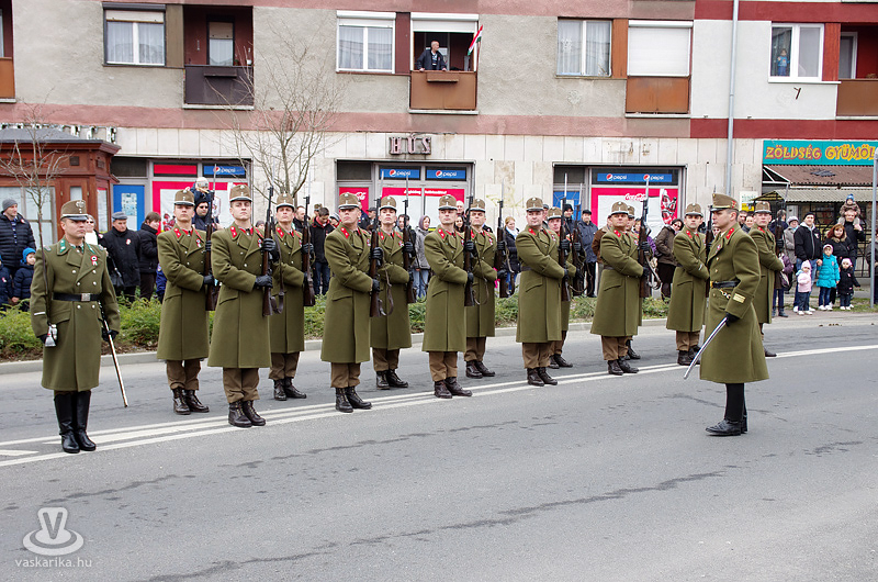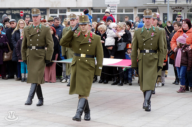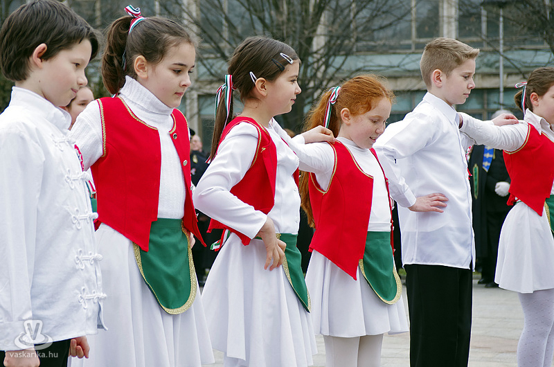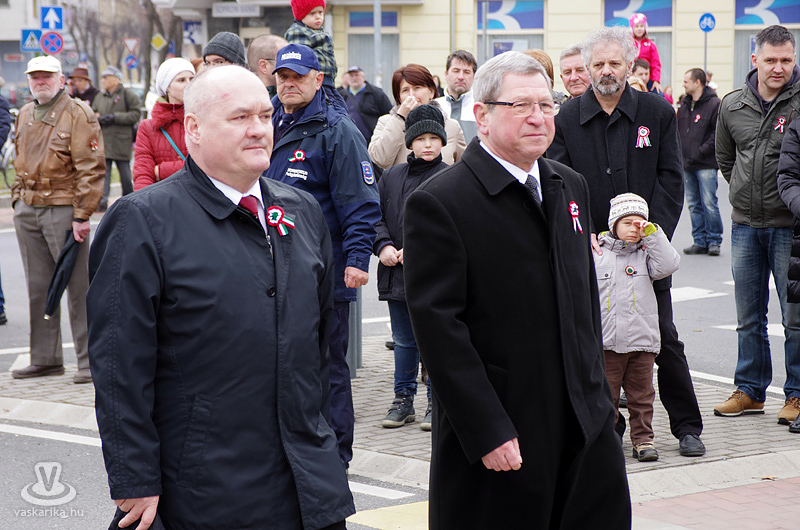 Ezt követően az ünneplő menet a Március 15-e térre vonult, ahol katonai tiszteletadás mellett először az országzászló ünnepélyes felvonására került sor, majd a Neumann János Általános Iskola diákjai adták elő ünnepi műsorukat, s nemcsak a 6-tagú énekkar, de általuk mi is kívül-belül piros, fehér, zöldbe burkolóztunk. A szürke időnek megadta az éles kontrasztot a zászlórúdra simuló lobogó és a megemlékezők kokárdáinak trikolorja.