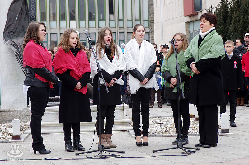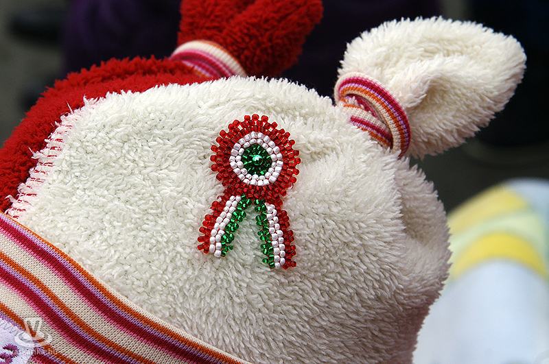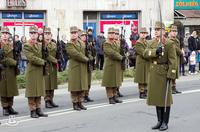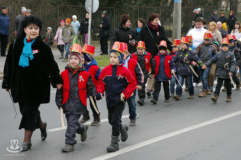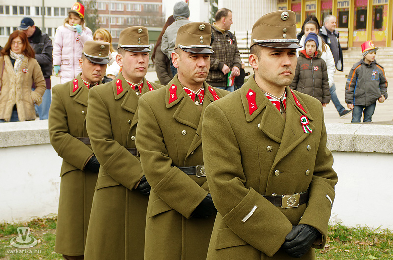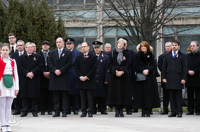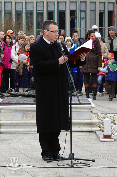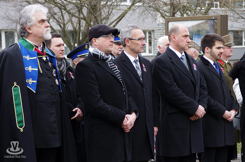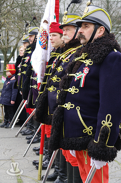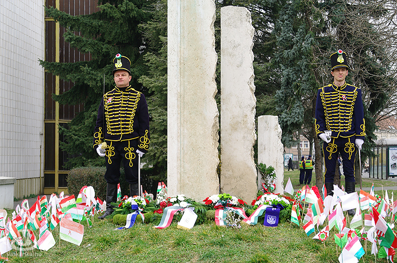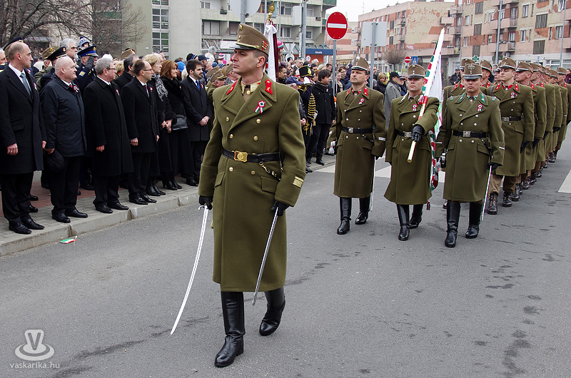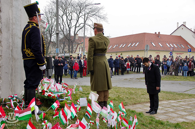 Ezt követően az ünneplő menet a Március 15-e térre vonult, ahol katonai tiszteletadás mellett először az országzászló ünnepélyes felvonására került sor, majd a Neumann János Általános Iskola diákjai adták elő ünnepi műsorukat, s nemcsak a 6-tagú énekkar, de általuk mi is kívül-belül piros, fehér, zöldbe burkolóztunk. A szürke időnek megadta az éles kontrasztot a zászlórúdra simuló lobogó és a megemlékezők kokárdáinak trikolorja.