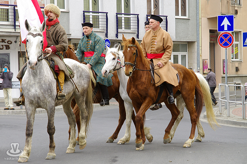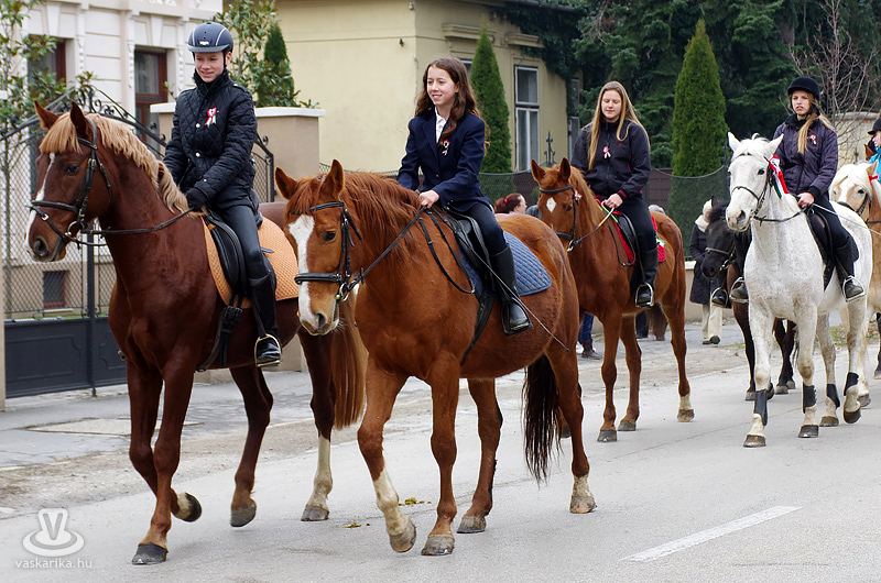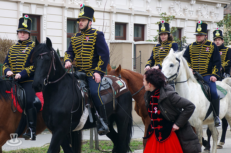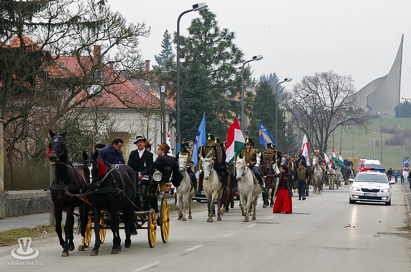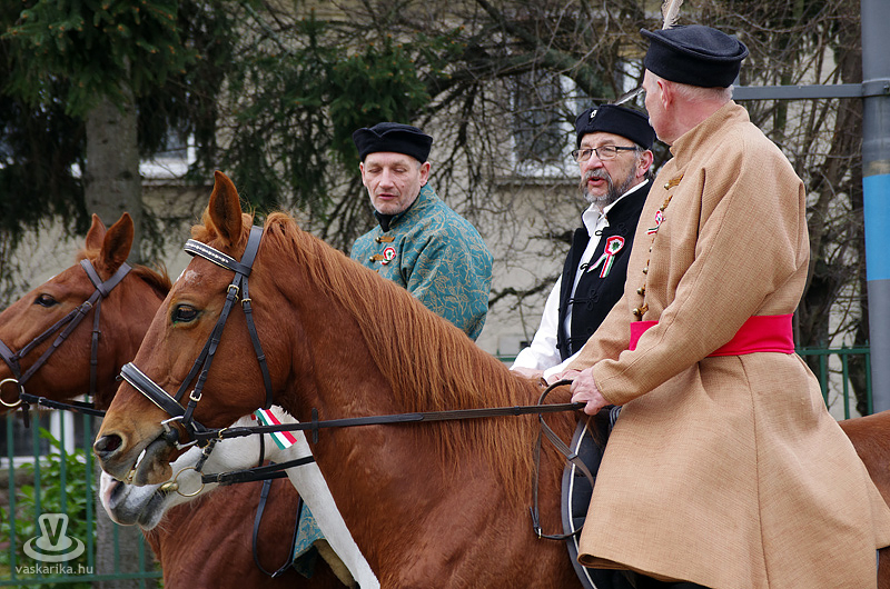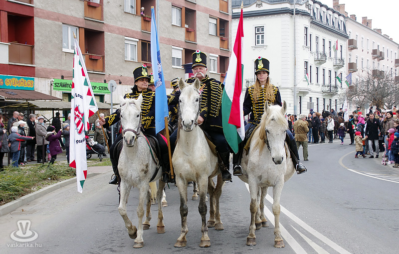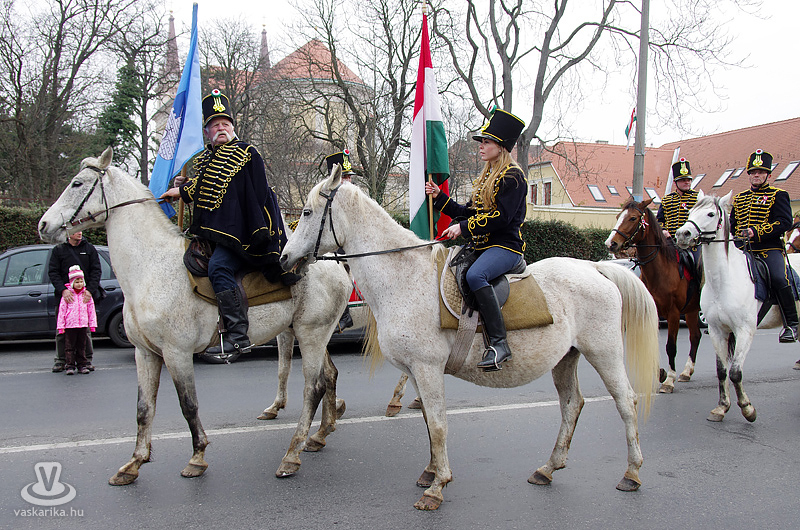 A március 15-i eseményeket a huszárok és lovasok felvonulása nyitotta, akik a Gagarin üdvözölték Szombathely korán kelő ünneplőit. Ahogy a hátaslovasok és hintók sora elvonult, az érdeklődők "forradalmi tömegként" mozogva indultak meg a programsorozat első ünnepi állomásához, az Ady-téri Petőfi-szoborhoz. Itt Prikazovics Ferenc állított emléket néhány perces beszédében a lánglelkű költőnek, aki az őt körülvevő zászlószőnyeg közepéből "a levegő uraként" tekintett az ünneplő tömegre. A beszédet követően Hende Csaba honvédelmi miniszter koszorúzta meg a szobrot, majd a város vezetői rótták le tiszteletüket.