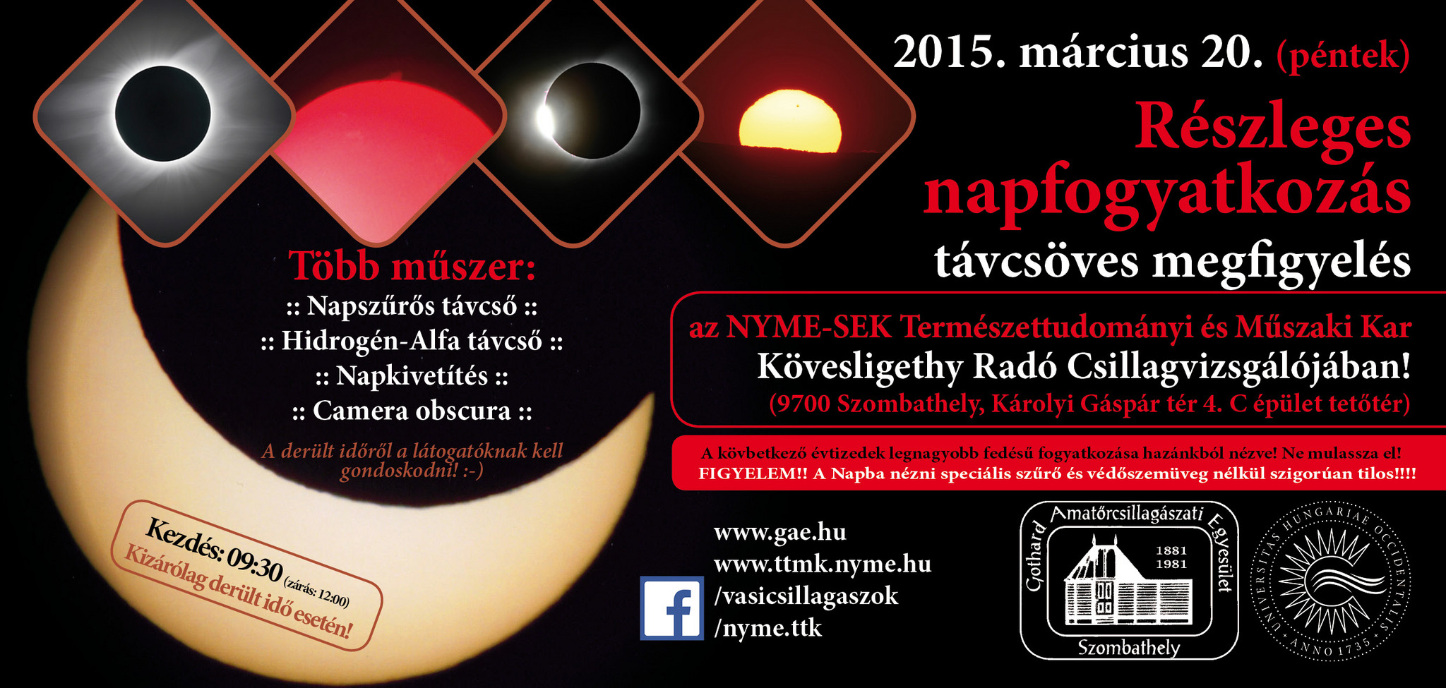 Március 20-án, pénteken lesz látható az évtized utolsó jelentős takarású és jól megfigyelhető részleges napfogyatkozása. A következő jelentős takarású fogyatkozásra 2026-ig kell várnunk. A helyszínen a látogatók napszűrős távcsővel, speciális Hidrogén-alfa távcsővel, valamint távcsöves napkivetítéssel, Camera Obscurával és speciális napmegfigyelő szemüvegekkel nézhetik meg a jelenséget.