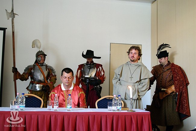 | Németh Szabolcs és Szabó Krisztián ismerteti a fesztivál programját, háttrében a Bethlen Gábor Hagyományőrség |