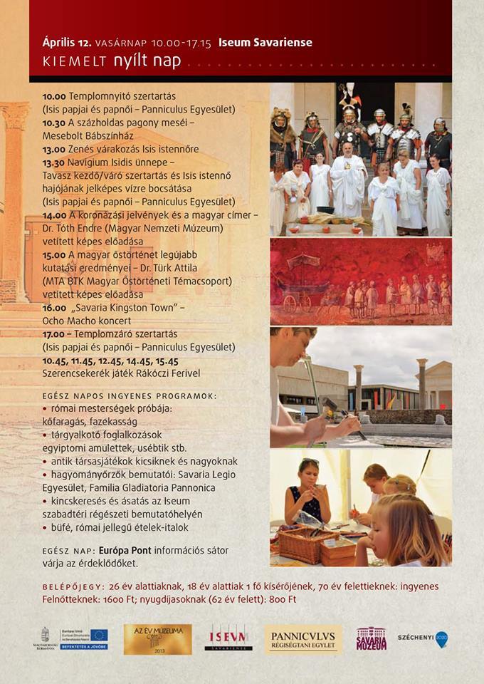 Római mesterségek próbája: kőfaragás, fazekasság; tárgyalkotó foglalkozások egyiptomi amulettek, usébtik stb.), antik társasjátékok, hagyományőrzők bemutatói (Savaria Legio Egyesület, Familia Gladiatoria Pannonica); kincskeresés és ásatás az Iseum szabadtéri régészeti bemutatóhelyén