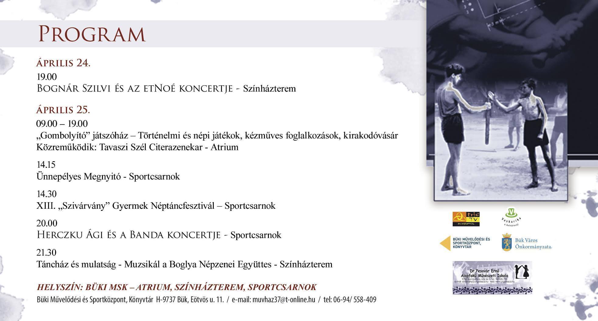 Április 24-25-én tizenharmadik alkalommal rendezik meg Bükön a Szivárvány Gyermek Néptáncfesztivált, melyen Bognár Szilvi és Herczku Ági is fellép. A néptáncfesztiválon 19 csoport és közel 500 táncos fog igazi néptáncos forgatagot alkotni.